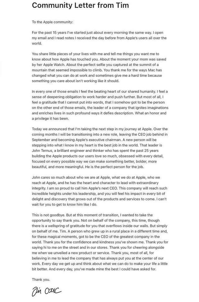 苹果突然官宣:库克(Tim Cook)将于9月卸任CEO。
